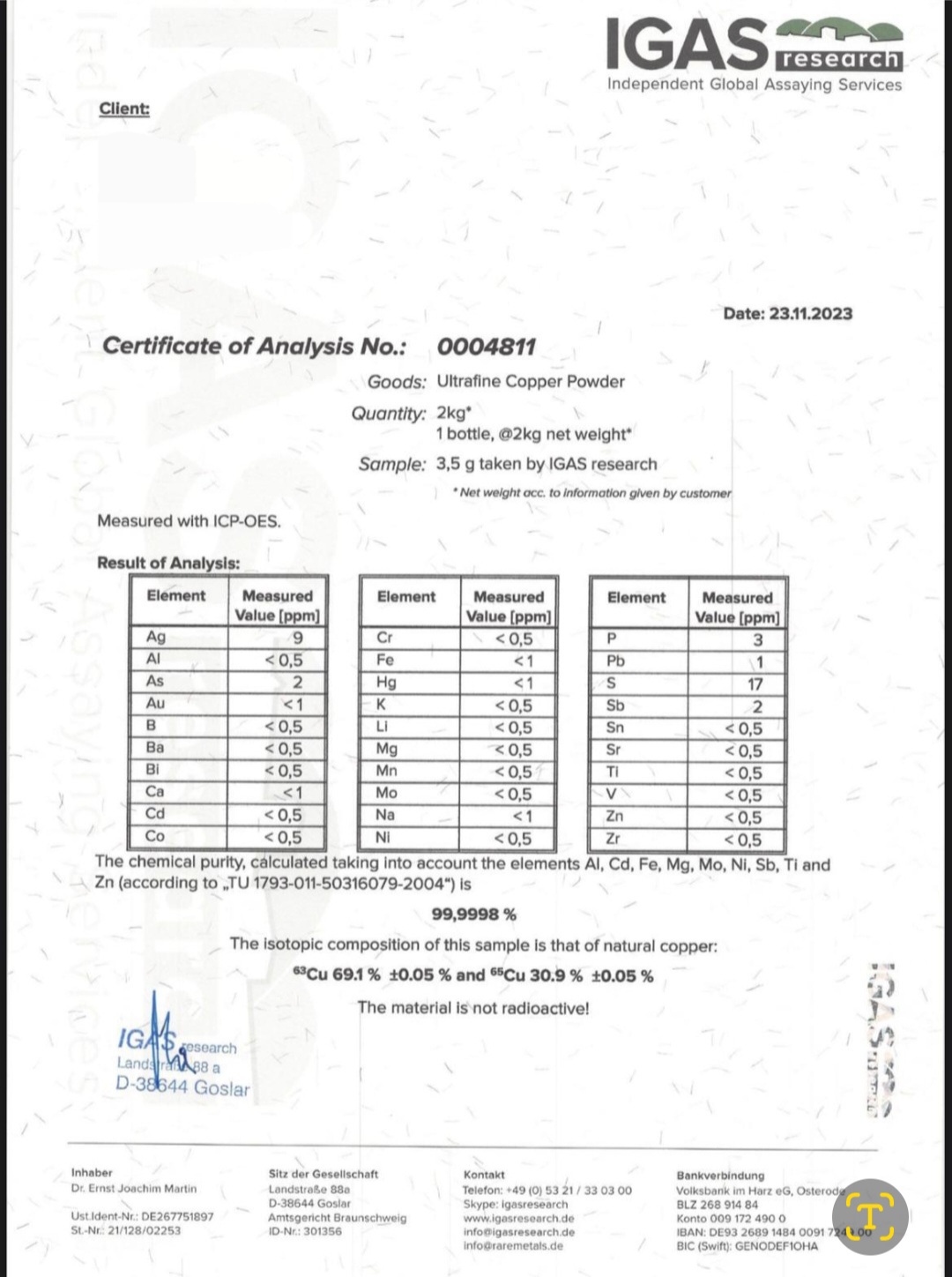 I have 7.5 tons of copper powder 99.9998% with price = €2 per gram.